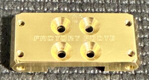 Factory Foote B7 0° Wide Aluminum Bulkhead. This bulkhead allows for the installation of the shorter B6 front arms on the B7 chassis. The bulkhead is machined out of domestic Brass. Four M3 set screws are included but not pictured.