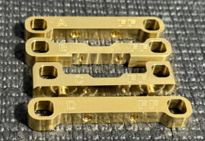 Factory Foote B84 A, B, C, D Blocks for B74 Arms. These suspension mounts enable the use of B74.2 A Arms. Crafted from Brass, with the idea to be able to fine tune your weight bias.